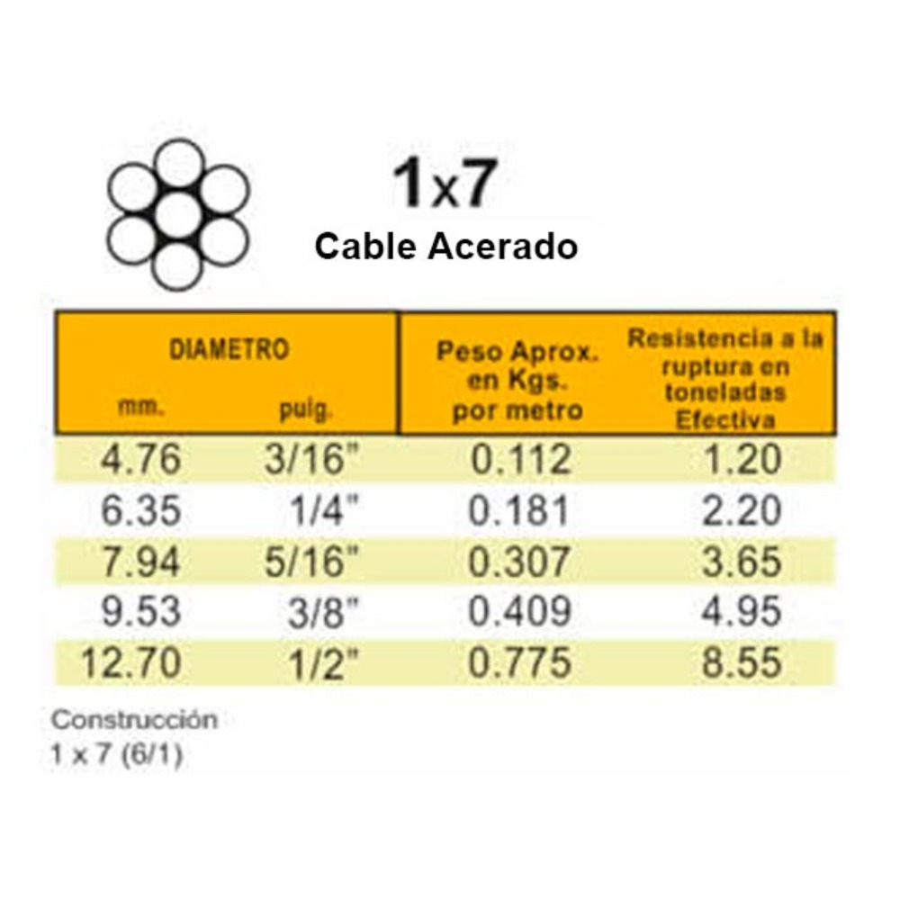 Cable de acero galvanizado de 7 hilos cableado uniformemente en toda su extensión con sentido anti horario. La galvanización es de acuerdo a la norma ASTM